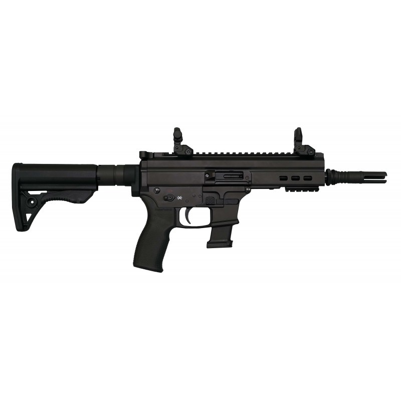Les accessoires montés sur l’arme sont une crosse télescopique pour s’adapter aux différentes morphologies des tireurs et une poignée type AR15 en plastique.