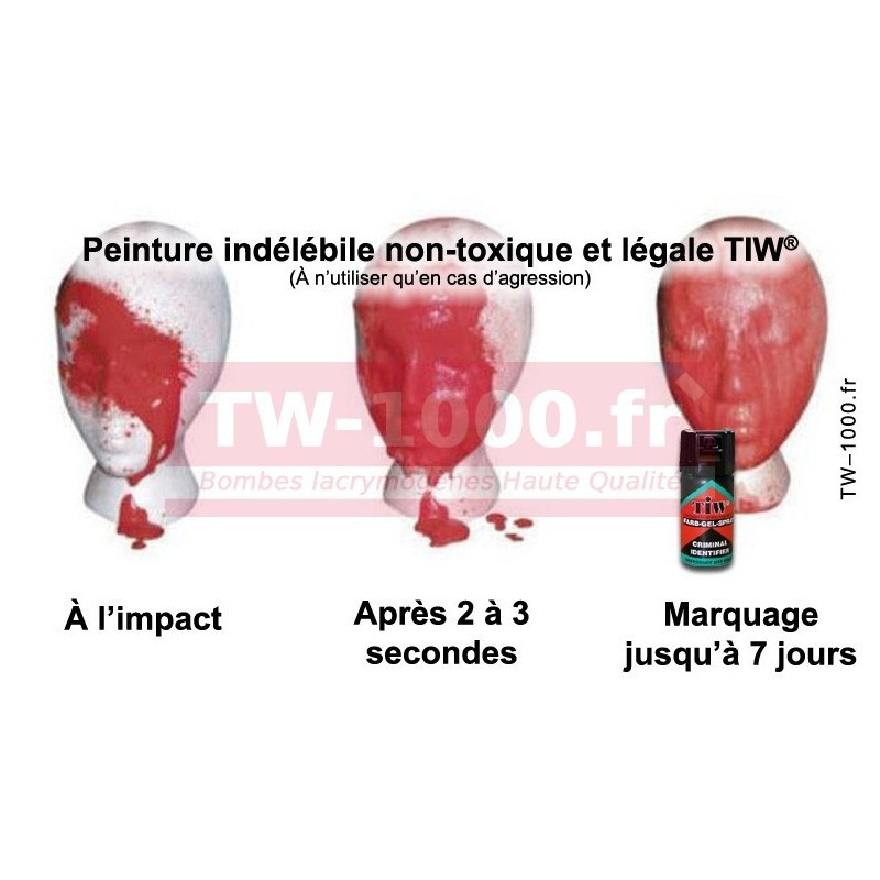 Attention, même si cette peinture est non toxique, elle ne doit être utilisée qu'en cas d'agression. Marquer quelqu'un avec une peinture indélébile pour plaisanter peut avoir des conséquences judiciaires.
