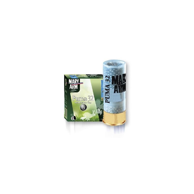 Cartouches Mary Arm Puma 32 (Calibre 12/67) Les cartouches Mary Arm Puma 32 en calibre 12/67 sont conçues pour les chasseurs à la recherche d'une munition polyvalente, fiable et confortable. Avec une charge de 32 g et une bourre grasse, elles offrent une dispersion large et régulière, idéale pour la chasse en plaine et en bois.