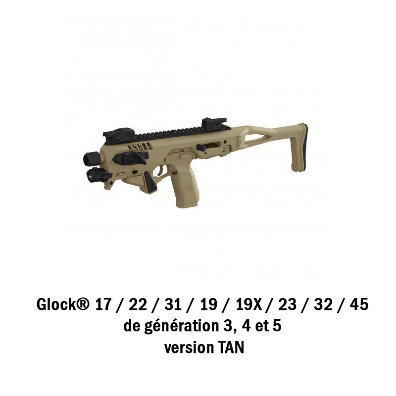 Le Micro Roni® génération 4X est la toute nouvelle génération de conversion d'un pistolet en carabine, compatible avec les Glock® 17 / 22 / 31 / 19 / 19X / 23 / 32 / 45 de génération 3, 4 et 5 (sauf les modèles compensés) et bénéficiant des dernières évolutions, notamment avec un accès direct au bouton pour refermer la culasse et une ouverture plus grande pour l'éjection de l'étui.