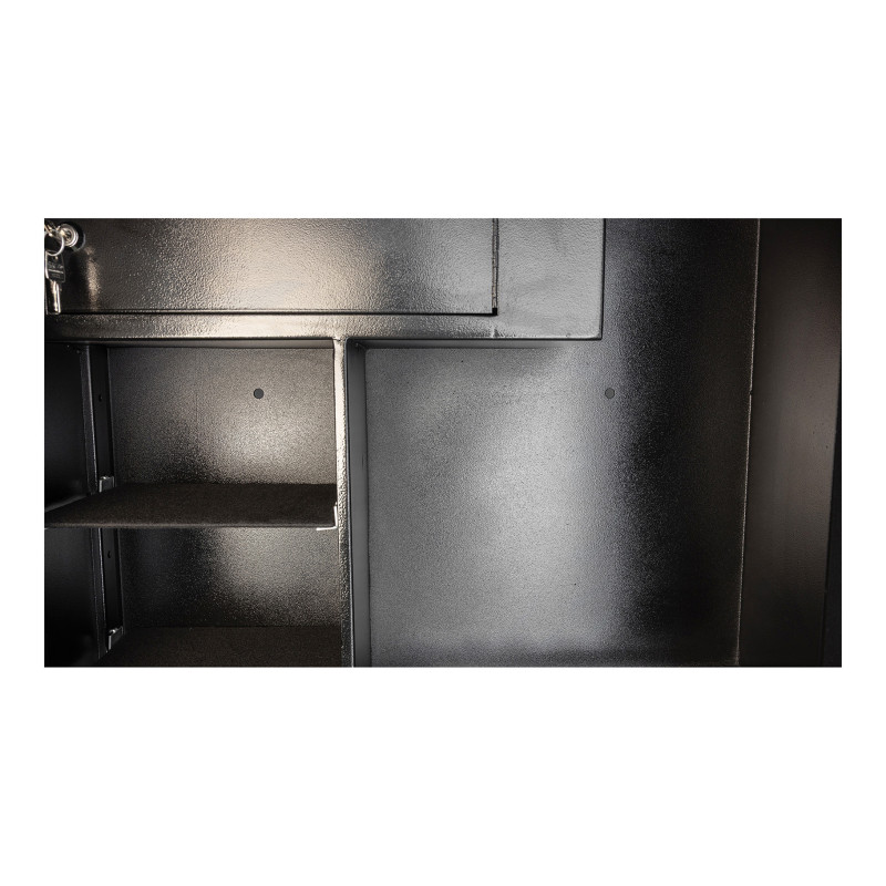 L’intérieur est équipé d’un râtelier pour armes longues et d’un revêtement protecteur, permettant de préserver vos armes contre les chocs et les rayures.