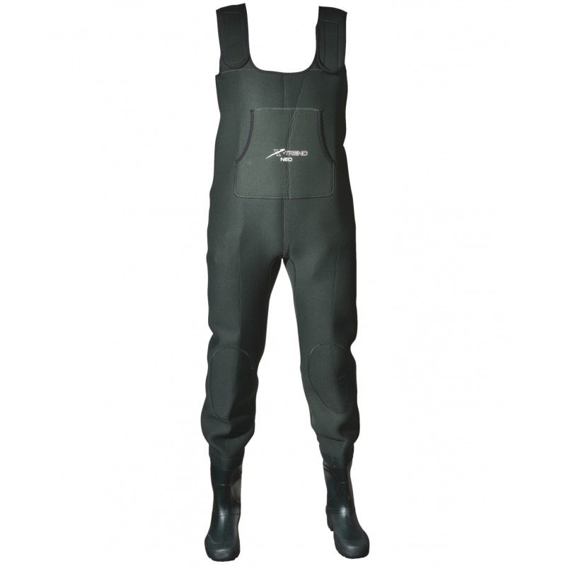 Pantalon néoprène 4 mm souple et confortable, bottes PVC. Renfort aux genoux, poche ventrale à fermeture velcro, bretelle néoprène réglables. Semelles crantées ergonomiques.