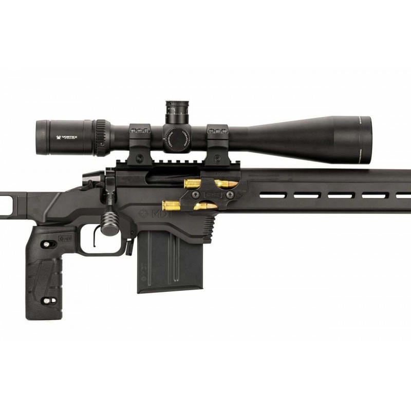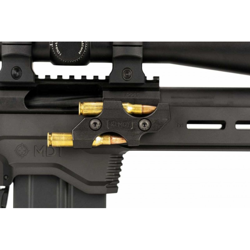 Grâce au support de cartouches de rechange multi-calibres MDT M-LOK, vous pouvez facilement stocker 2 cartouches supplémentaires sur le côté de votre carabine.
