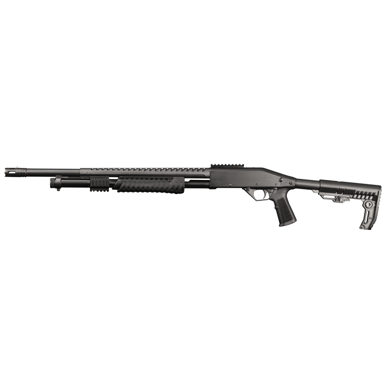 Le SR-12 Tactical dispose d’une crosse synthétique résistante conçue pour supporter une utilisation régulière. La pompe ergonomique assure une manipulation fluide et un cycle d’armement rapide.