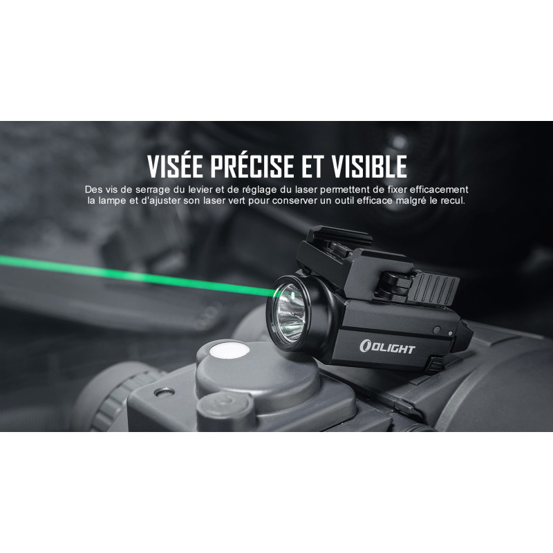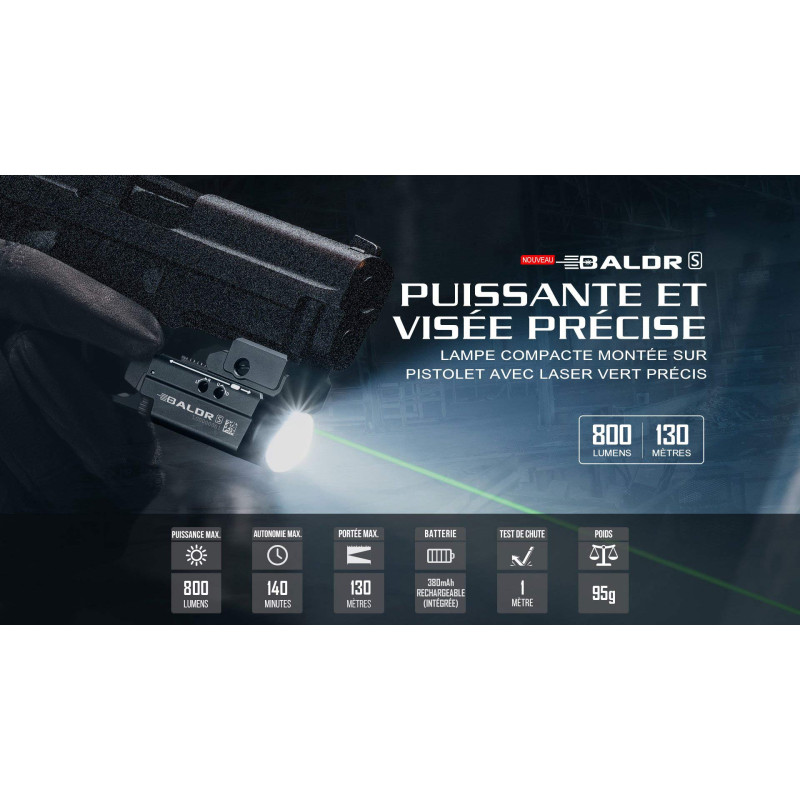La Baldr S combine LED blanche et laser vert dans un format compact et puissant. Compatible rails GL et MIL-STD-1913, elle équipe les systèmes tactiques compacts. Deux niveaux : haut 800 lm et bas 100 lm. Vis de serrage et réglage du laser assurent une fixation sûre et un alignement durable malgré le recul.