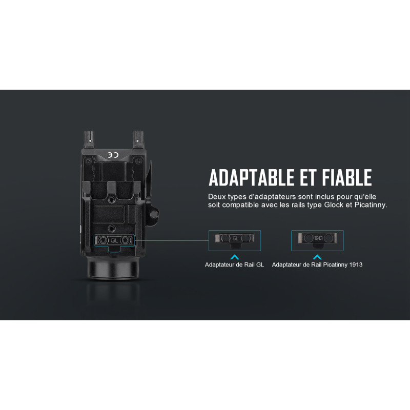 Adaptée aux canons compacts pour un port discret, son support de rail coulissant s’ajuste à la longueur du canon. Batterie Li-Po intégrée 380 mAh — autonomie maximale jusqu’à 140 minutes.