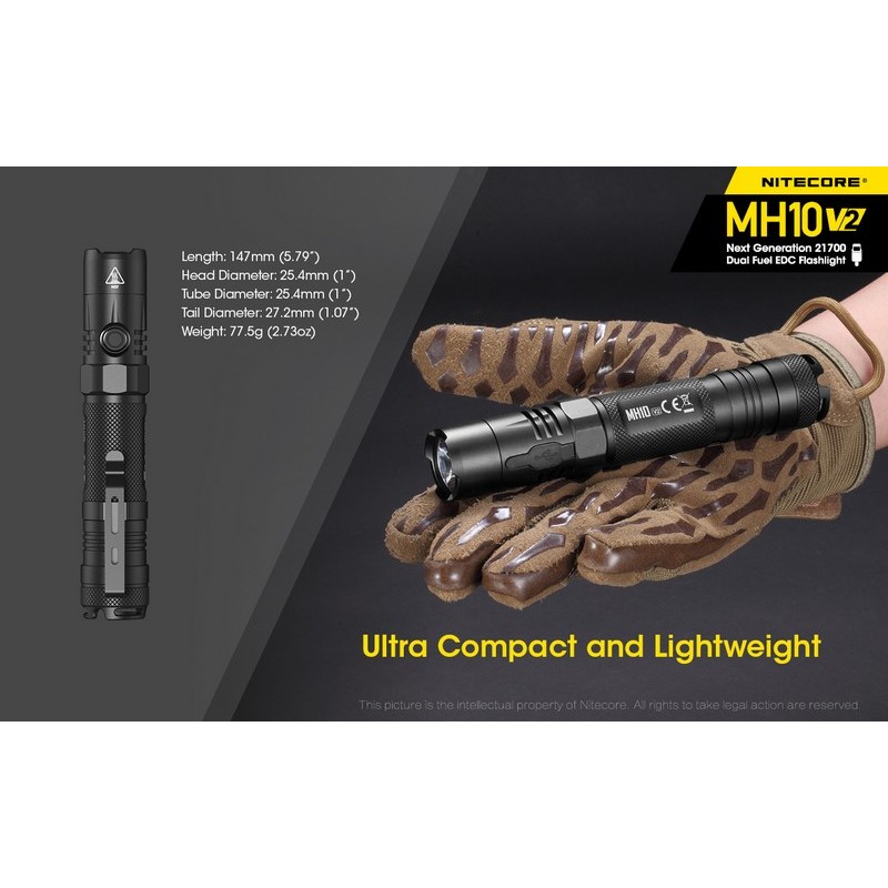 La lampe Nitecore MH10V2 est une lampe de poche rechargeable par USB, offrant une puissance maximale de 1200 lumens.