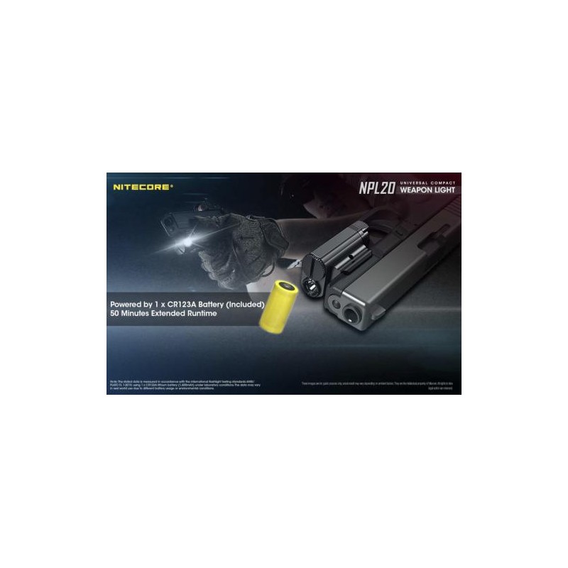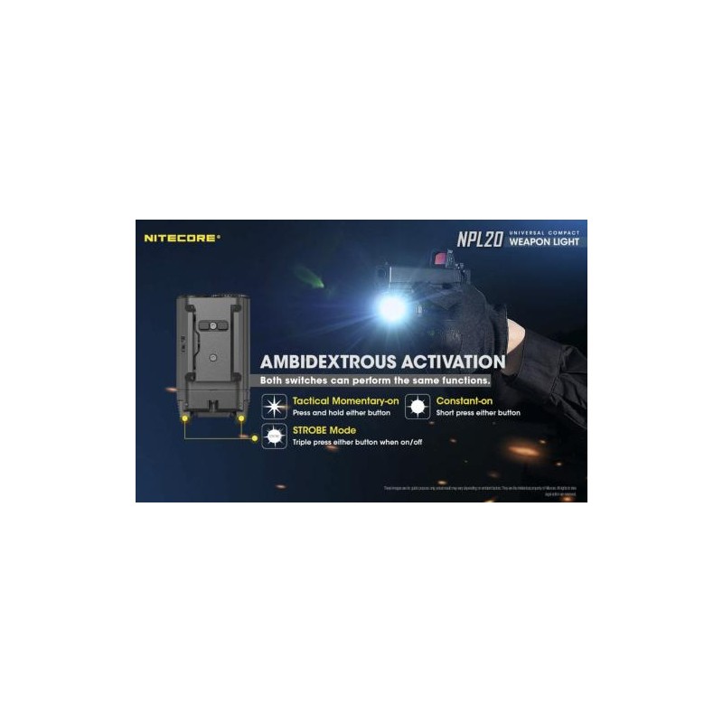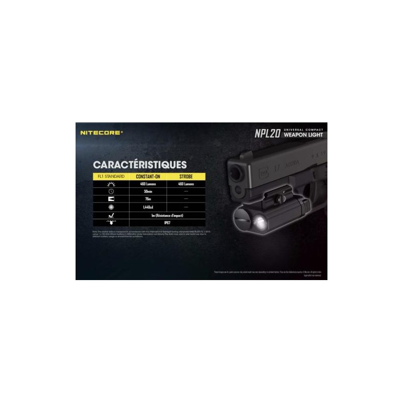 Lampe étanche compatible avec toutes les armes de poing équipées d'un rail Picatinny. Conçue sur un mode ambidextre.