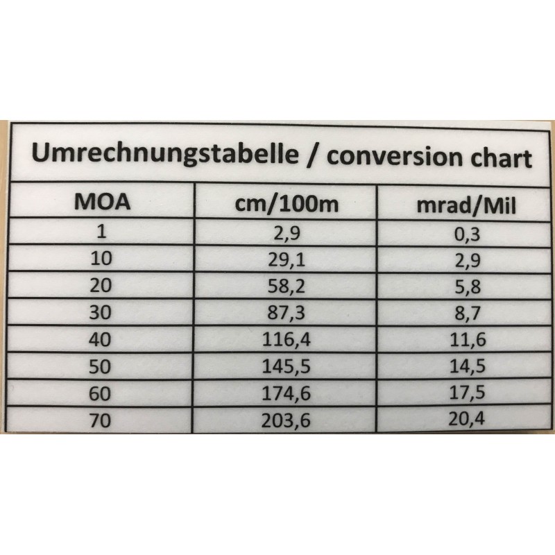Réglable de 0 à 70 MOA par pas de 10 MOA chacun. Il n'est pas nécessaire de retirer la monture car un ajustement sur l'arme est possible.