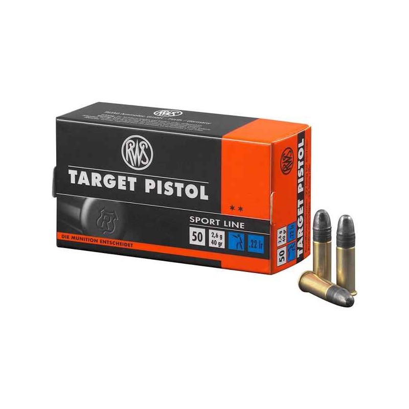 Cartouches RWS calibre 22 LR Target Pistol. Balles de 2,6 grammes, vitesse initiale 285 mètres / seconde.