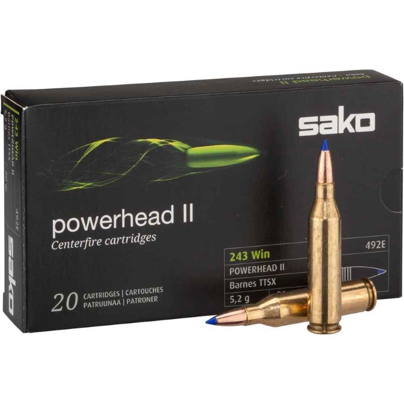 La cartouche de grande chasse Sako Powerhead II en calibre .243 Winchester et 80 grains est une balle Barnes TTSX à pointe polymère et nez creux reconçu qui procure une expansion encore plus rapide que la TSX originale. La pointe polymère initie cette expansion rapide et améliore la balistique à longue distance pour la chasse à l'approche. La rétention de poids initial est de plus de 99%.