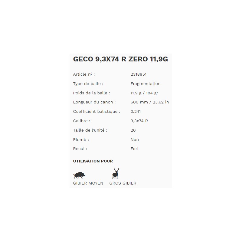 La GECO Zero en calibre 9.3x74 R et 184 grains se caractérise par une précision hors du commun et un excellent effet à l’impact. Sans plomb, l'ogive blindée est composée de deux noyaux en étain. Grâce à sa tête creuse, le noyau avant préfragmenté se déforme à l’impact en libérant son énergie pour un effet instantané. Le deuxième noyau assure une pénétration en profondeur de l’ogive.