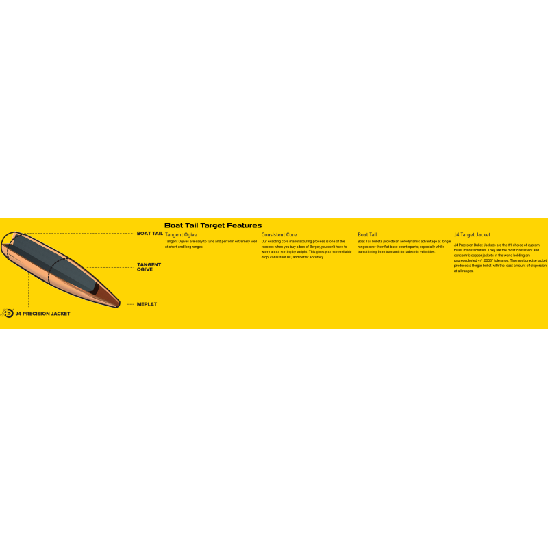 Les ogives Berger Long Range BT Target sont conçues pour les tireurs exigeants qui recherchent une précision maximale et des performances constantes sur de longues distances. Chaque ogive est fabriquée avec un savoir-faire rigoureux afin d’assurer une trajectoire stable et une excellente tenue au vent, ce qui en fait le choix privilégié des compétiteurs et des passionnés de tir de précision.