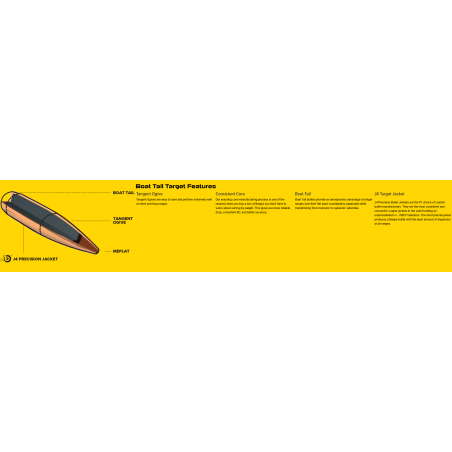 Conçues pour le tir de compétition et le tir longue distance, ces ogives Boat Tail (BT) offrent un coefficient balistique optimisé garantissant une trajectoire prévisible et une régularité exceptionnelle à chaque tir. Le noyau en plomb de haute qualité et la chemise en cuivre assurent une performance fiable, tandis que le profil aérodynamique minimise la dispersion et améliore la stabilité, même par conditions venteuses.