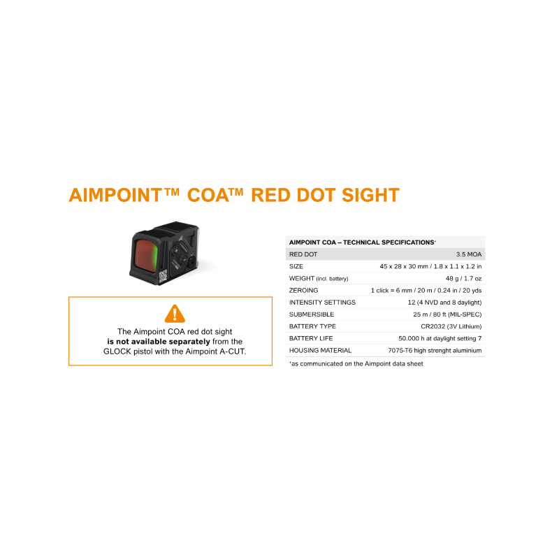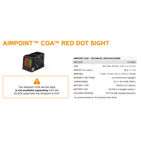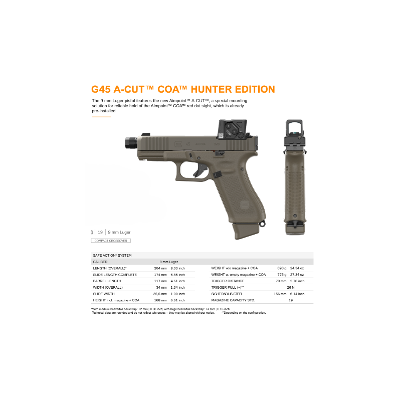 Le pistolet Glock 45 Hunter Edition A-CUT fileté – Combo Aimpoint COA est une version haut de gamme pensée pour les tireurs exigeants, combinant fiabilité légendaire Glock, ergonomie moderne et optique de pointe. Cette édition spéciale se distingue par son design soigné et ses équipements orientés performance.