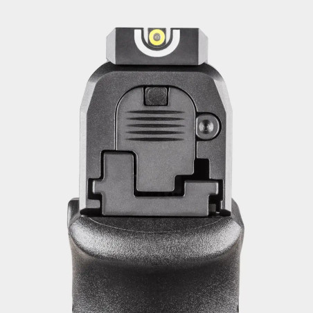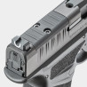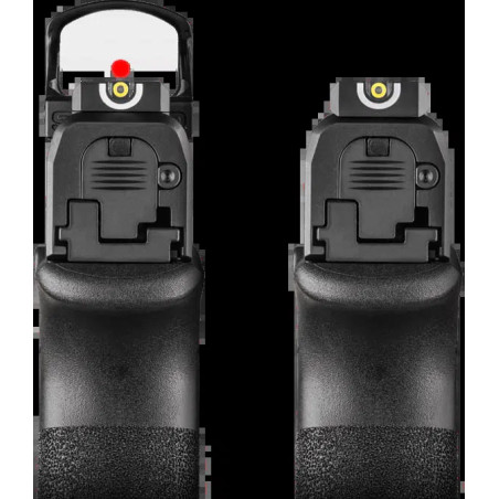 Le Hellcat OSP (Optical Sight Pistol) se distingue par sa glissière usinée permettant le montage direct d’une optique micro point rouge, sans modification. Cette compatibilité améliore la rapidité d’acquisition de la cible et la précision, notamment lors des tirs dynamiques. Les organes de visée d’origine sont conçus pour cohabiter efficacement avec une optique, garantissant une visée fiable en toutes circonstances.