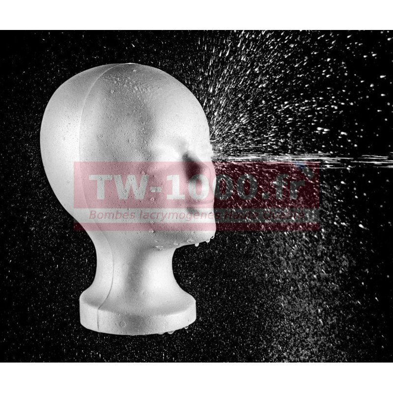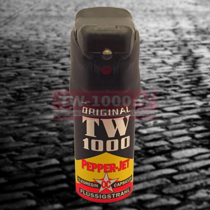 Bombe lacrymogène TW 1000 Pepper-Jet avec une projection de jet liquide au poivre.