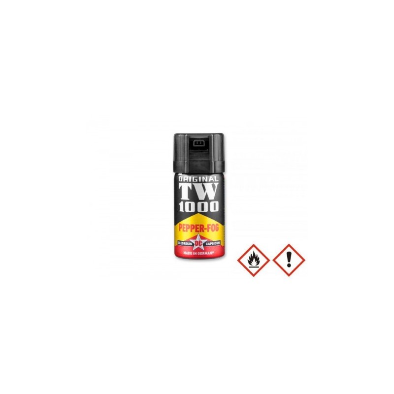 Bombe lacrymogène TW 1000 Pepper-Fog avec une projection de gaz au poivre.