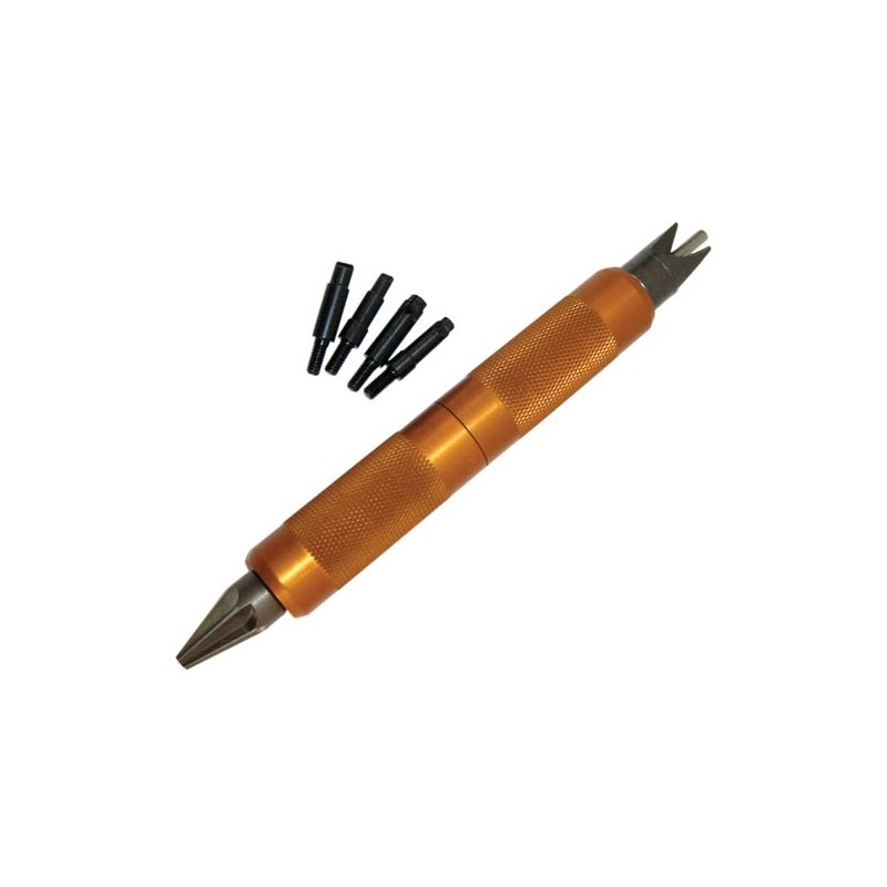 Le nouveau Lyman Case Prep Multi-Tool contient tous les outils essentiels pour la préparation de vos douilles de rechargement. Le poignée en laiton se devisse par le milieu pour permettre le stockage des différents embouts - ébavureur interieur, ébavureur extérieur, nettoyeurs et alésoirs de logement d'amorce.
