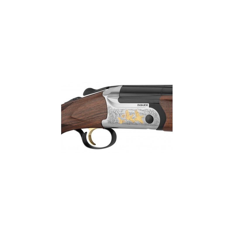 Fusil de chasse superposé de calibre 12 de marque ELOS. Le modèle ELOS A2 Classic AL Gold se distingue par ses élégants motifs dorés.