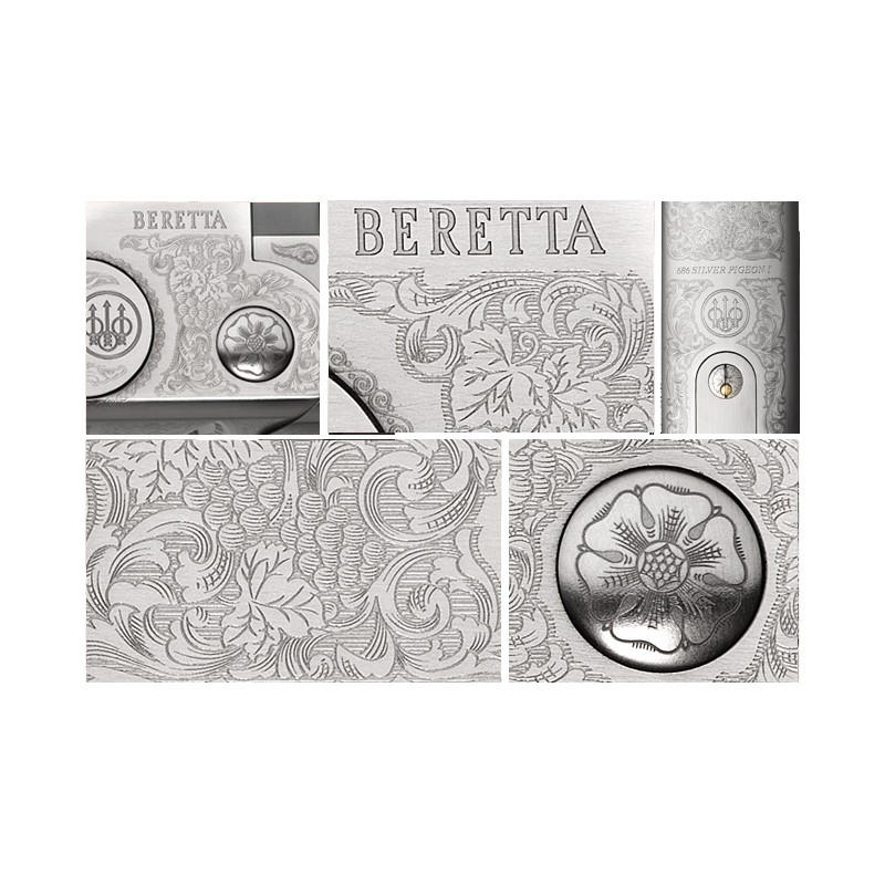 Le thème, créé par les Maîtres Graveurs Beretta, est un élégant motif floral enrichi de feuilles et grappes de raisin porteuses d’espoir, qui s’étendent jusqu’à la clé d’ouverture, en donnant un résultat agréable à l’œil ainsi qu’une prise parfaite pendant l’utilisation.
