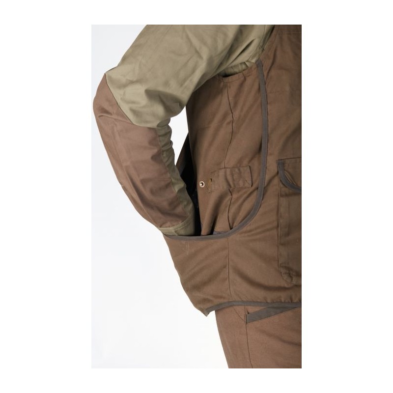 Gilet de chasse de couleur brun, déperlant et léger, poches rapidement accessibles, idéal pour la chasse par temps ensoleillé.